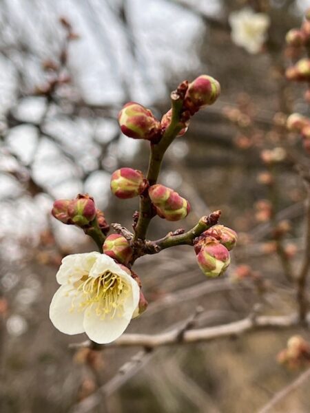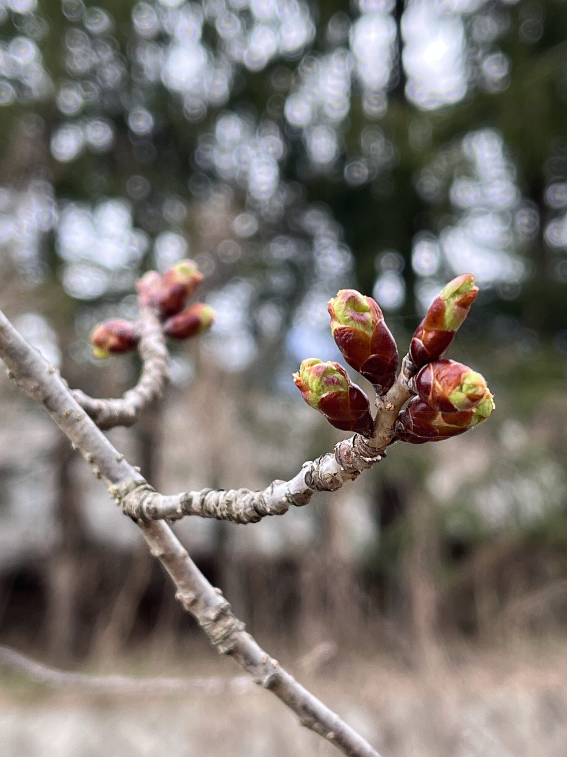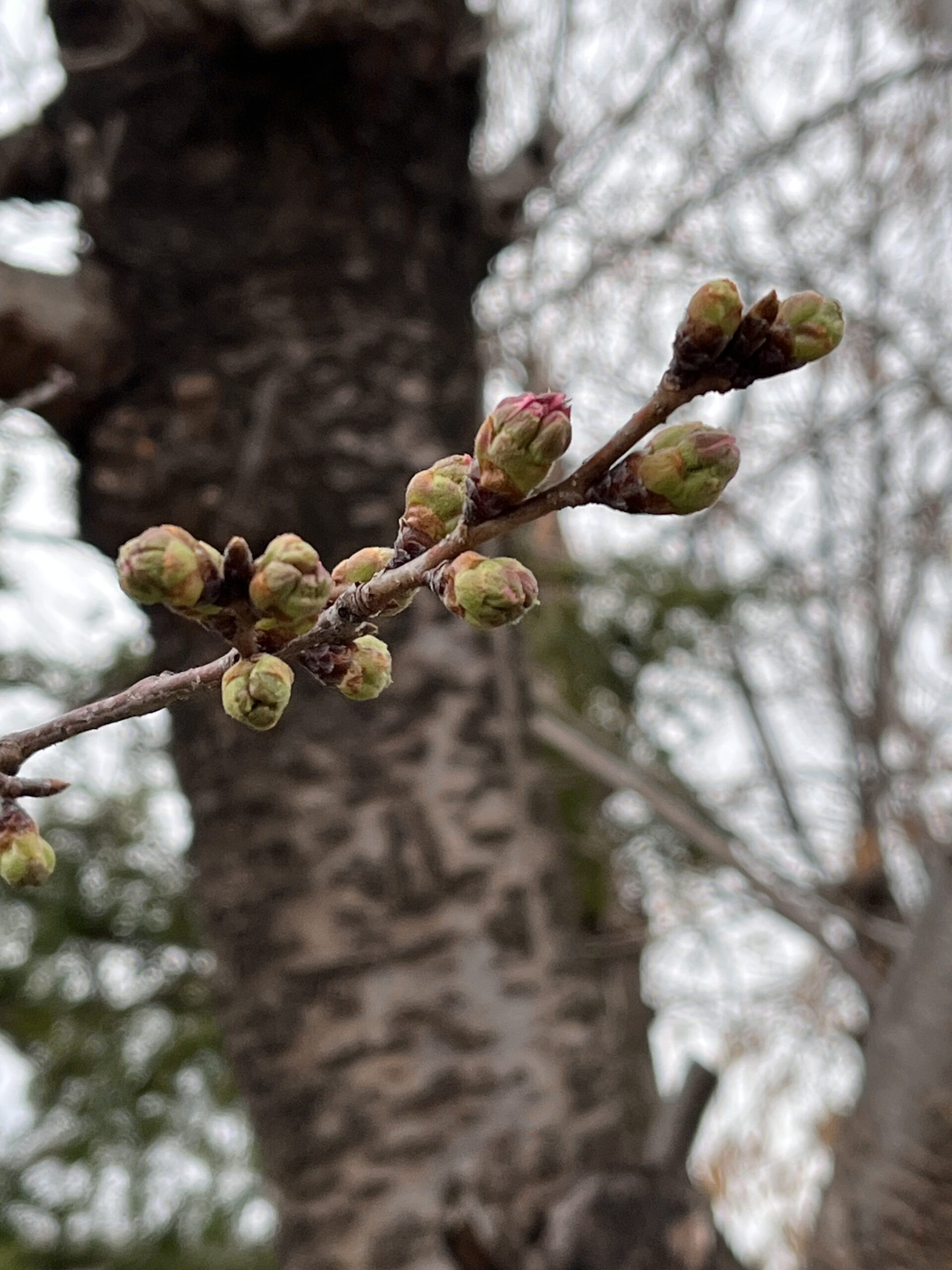 桜のつぼみはまだまだこのぐらい。先っちょにほんのすこーしだけピンクが見えてきてるものもあります。
