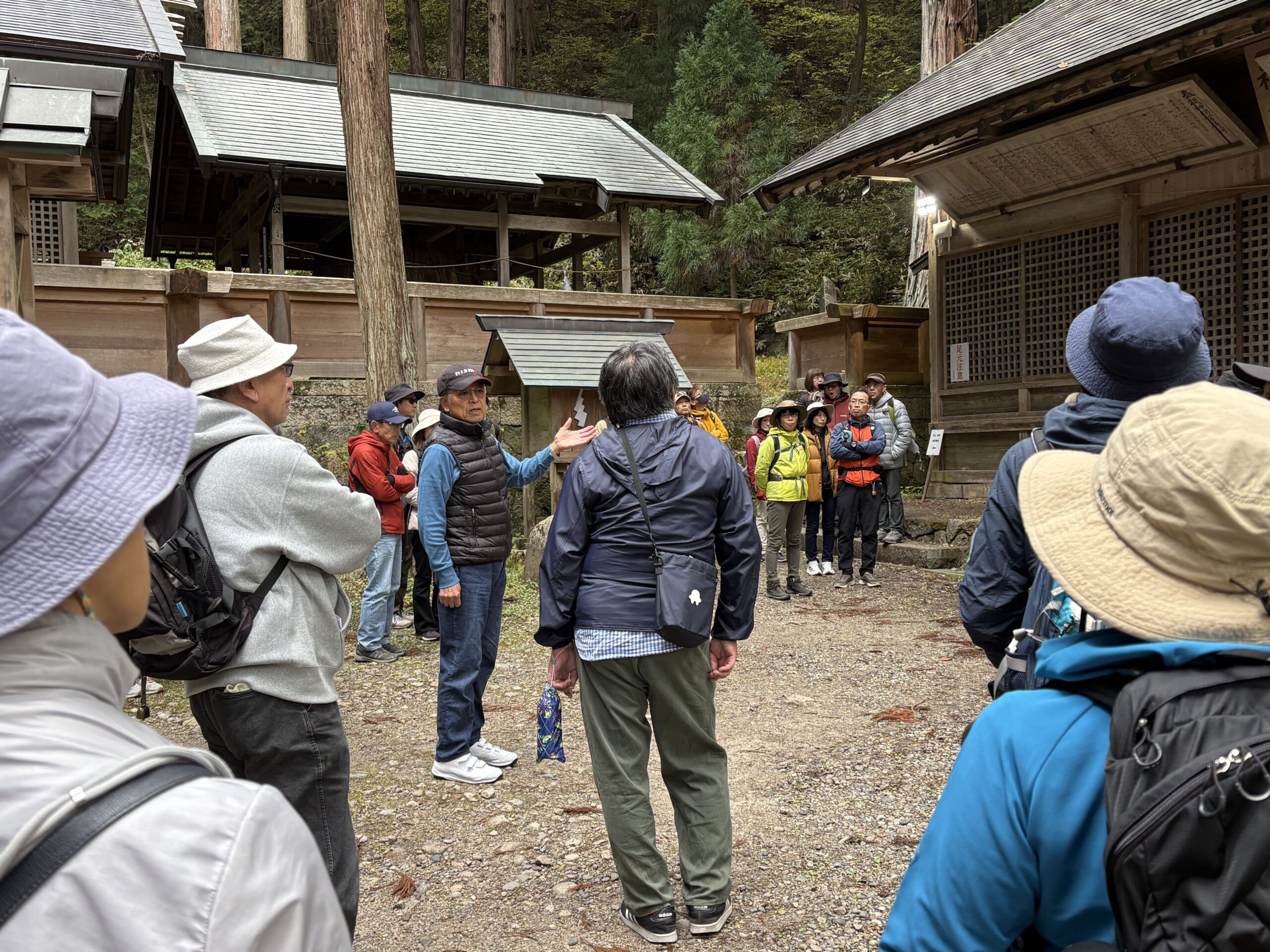 仁科神明宮の氏子総代の矢口さんによるお宮の歴史などの解説を、ききいる参加者のみなさん。