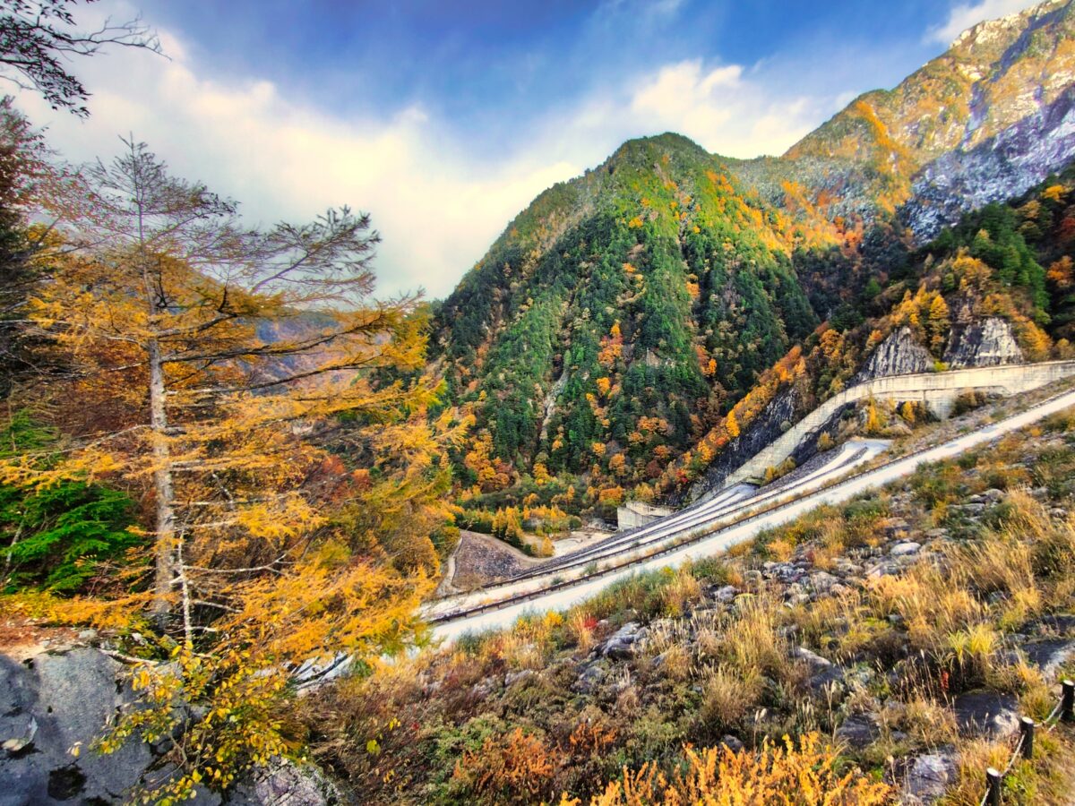 大町ダム、七倉ダム、高瀬ダムの3つのダムが連なり、特に紅葉の時期は美しい景観が広がります。高瀬ダムは黒部ダムに次ぐ高さを誇るロックフィルダム(岩石を積み上げたダム)であり、2005年ダム湖100選にも選ばれている素晴らしいダムです。