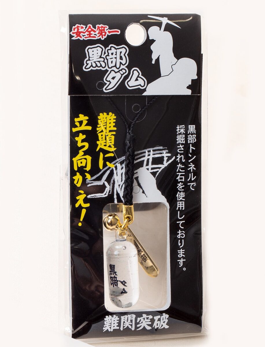 難関突破根付は、受験や資格試験の合格祈願の思いを込めたお守り型のグッズです。黒部トンネルで採掘された岩の破片がカプセルの中に入っています。