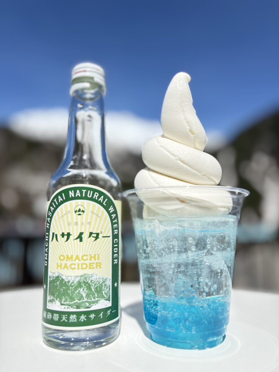 ハサイダーフロートは、黒部ダムの放水をイメージした炭酸ドリンクにソフトクリームをのせた人気商品です。ブルーの色合いが特徴的で、すっきりとした炭酸とソフトクリームの組み合わせが絶妙です。夏場は特に人気が集中します。