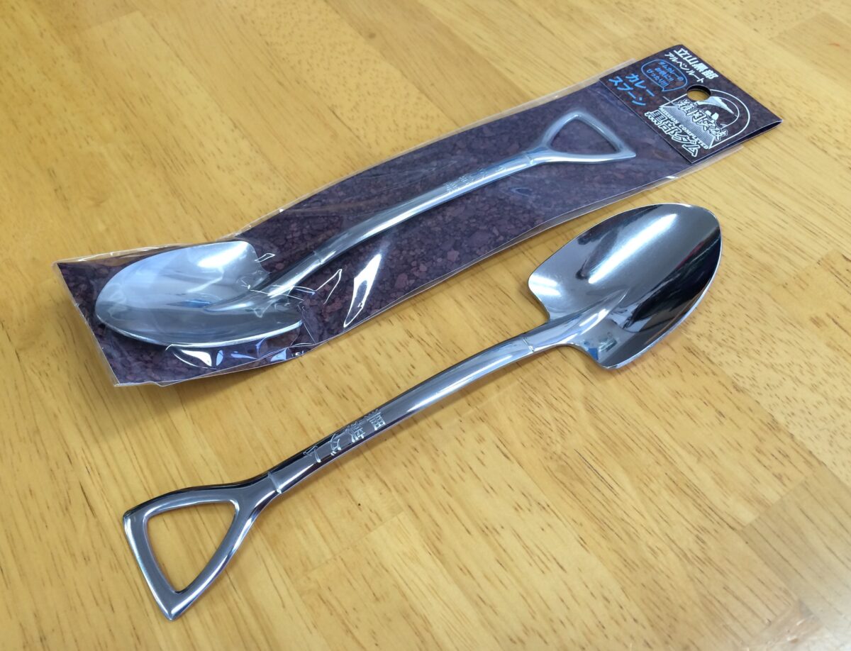 建設用スコップを模したステンレス製のスプーンです。カレースプーン(大)、ゴールドスコップスプーン、角スコップスプーン(小)の3種あり、いずれも黒部ダム刻印が入っています。