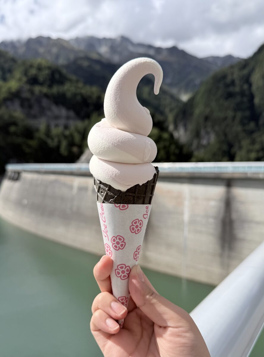 食べやすいコーンタイプで、黒部湖を眺めながら楽しむ人も多く見られます。提供時間は短く、混雑時でも比較的スムーズに購入できるでしょう。