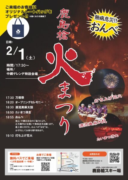 今年も鹿島槍スキー場では、2月1日(土)中綱ゲレンデ特設会場にて火まつりが行われます。万燈祭から始まり、迫力ある太鼓の演奏、たいまつ滑走、打ち上げ花火などをお楽しみいただけます。夕方17時からはおしるこの振る舞いも!