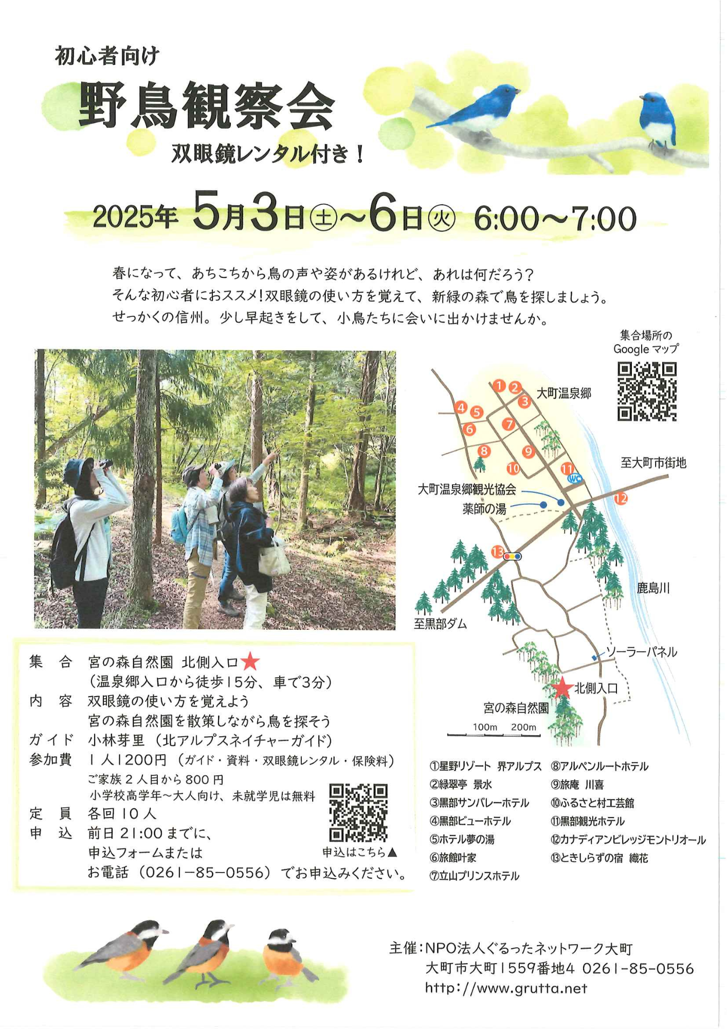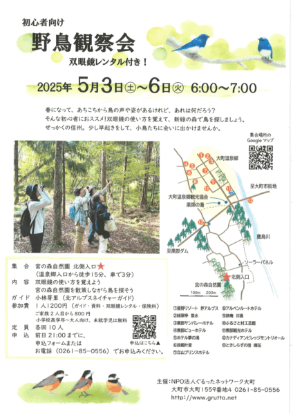 NPO法人ぐるったネットワーク大町より、初心者むけの野鳥観察会のお知らせです!