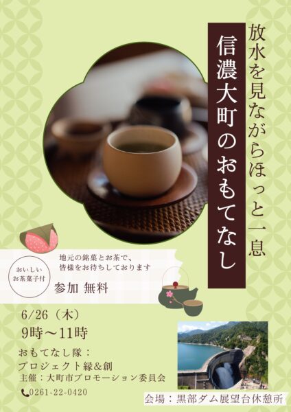 黒部ダム観光放水開始に合わせて、黒部ダムで地元のお母さん達(おもてなし隊「プロジェクト縁&創」)がおもてなしを行います。