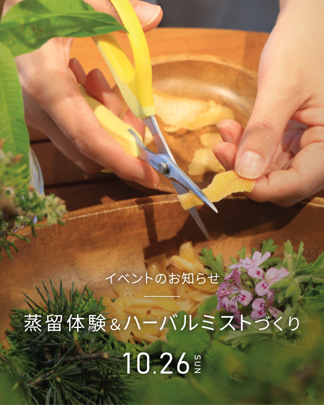 ご参加のみなさんで、ガーデンのハーブを摘み取り、蒸留のしくみを学びながら、この日だけの特別なミストをお持ち帰りいただけます。植物に触れ、香りに包まれたひとときをお過ごしください。