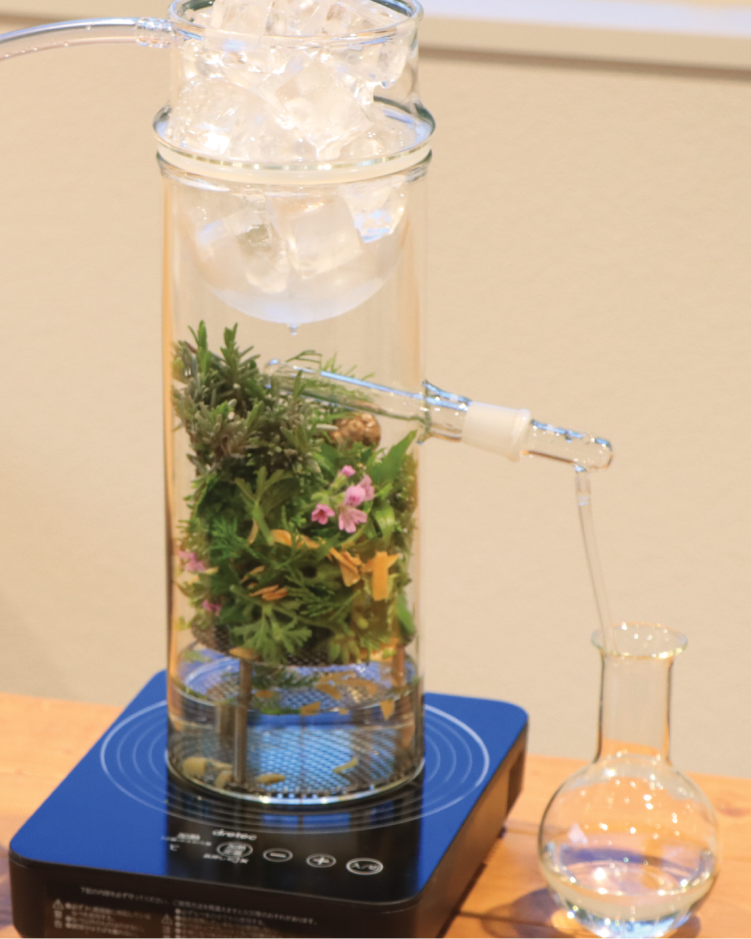 蒸留器でアロマウォーター(芳香蒸留水)を抽出し、精油とブレンドして空間用のスプレー「ハーバルミスト」を作るワークショップが開催されます。