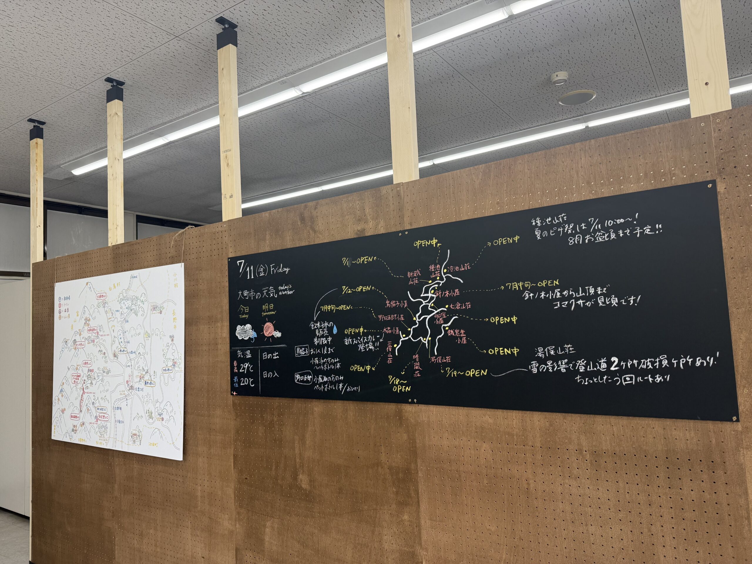 山の天気や登山道の状況などリアルタイムの情報を収集できるインフォメーションボードがあります。また、登山時の行動食や備品の販売しております。