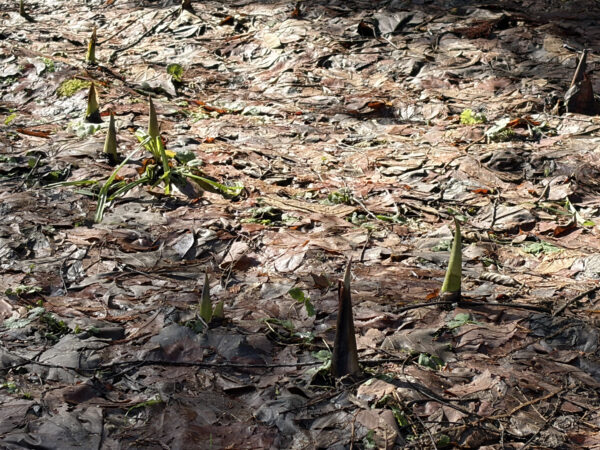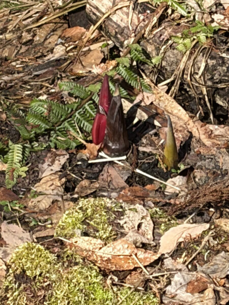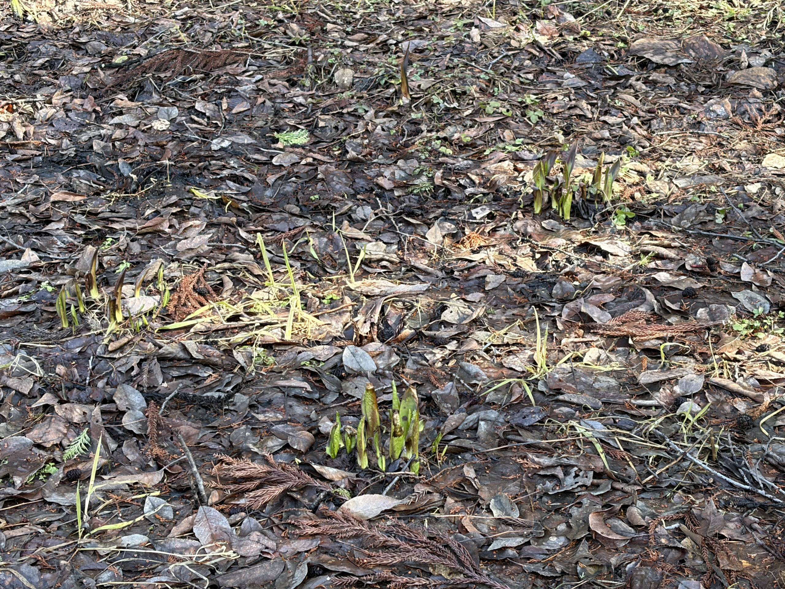 宮の森自然園のザゼンソウは芽がだいぶでてきました。 ニョキニョキ生えているタケノコみたいのがそうです。