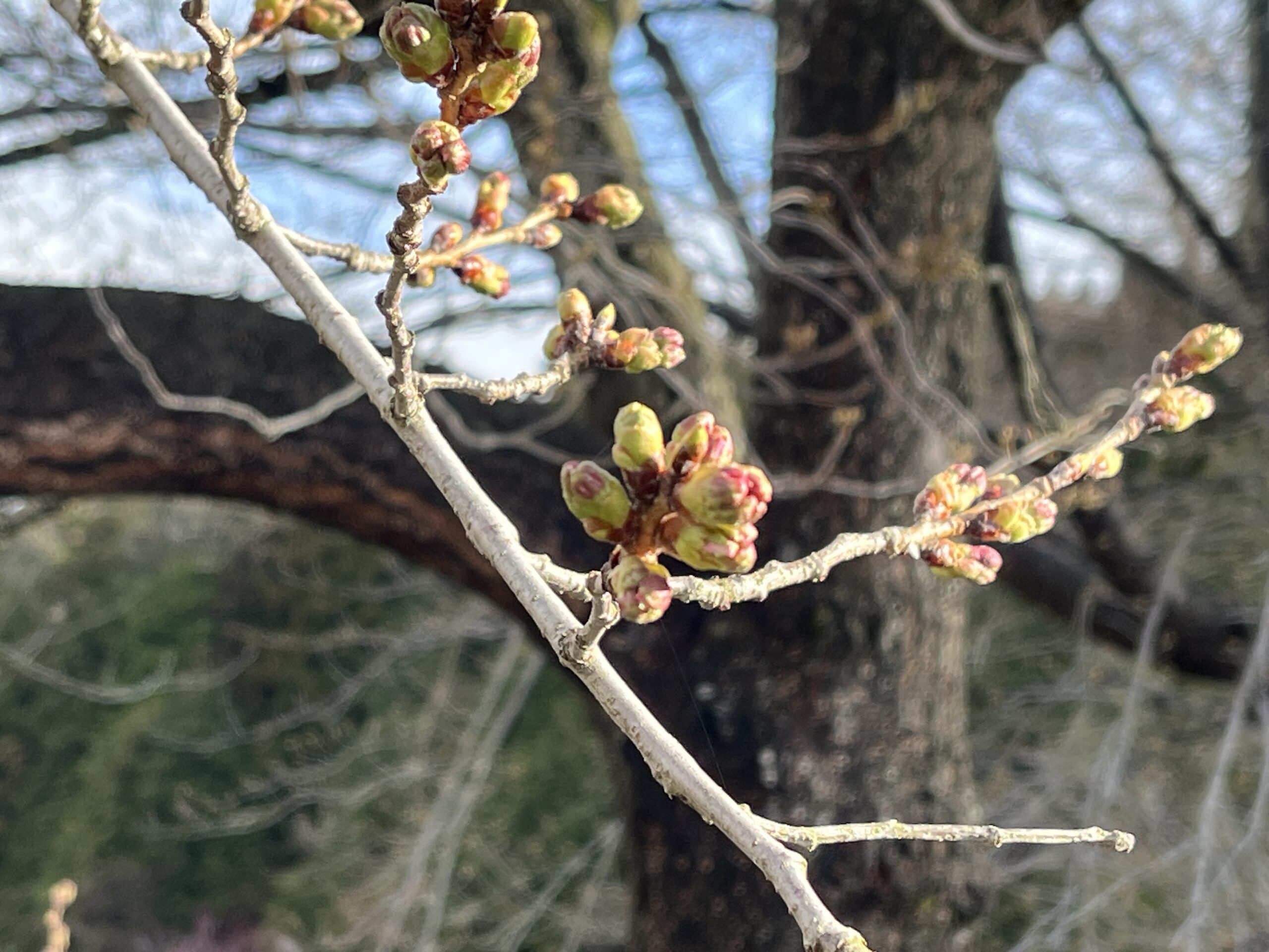 日当たりの良い木はだいぶ膨らんでましたが、まだつぼみです。