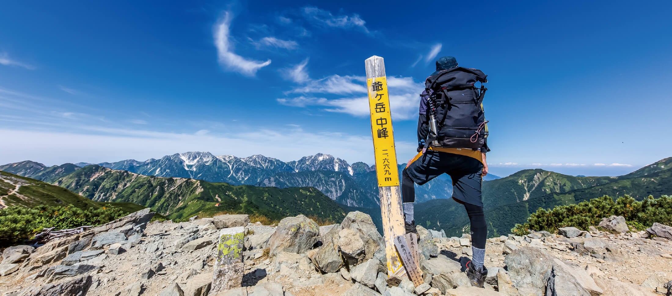 乌帽子岳位于北阿尔卑斯的中央地带,也是有名的“里银座纵走路线”的起点。山顶部分有一块竖立的柱状岩石(方尖碑),而通往那里的“橅立尾根”则是北阿尔卑斯三大陡坡之一。翻过这段后,壮丽的全景即呈现在眼前。