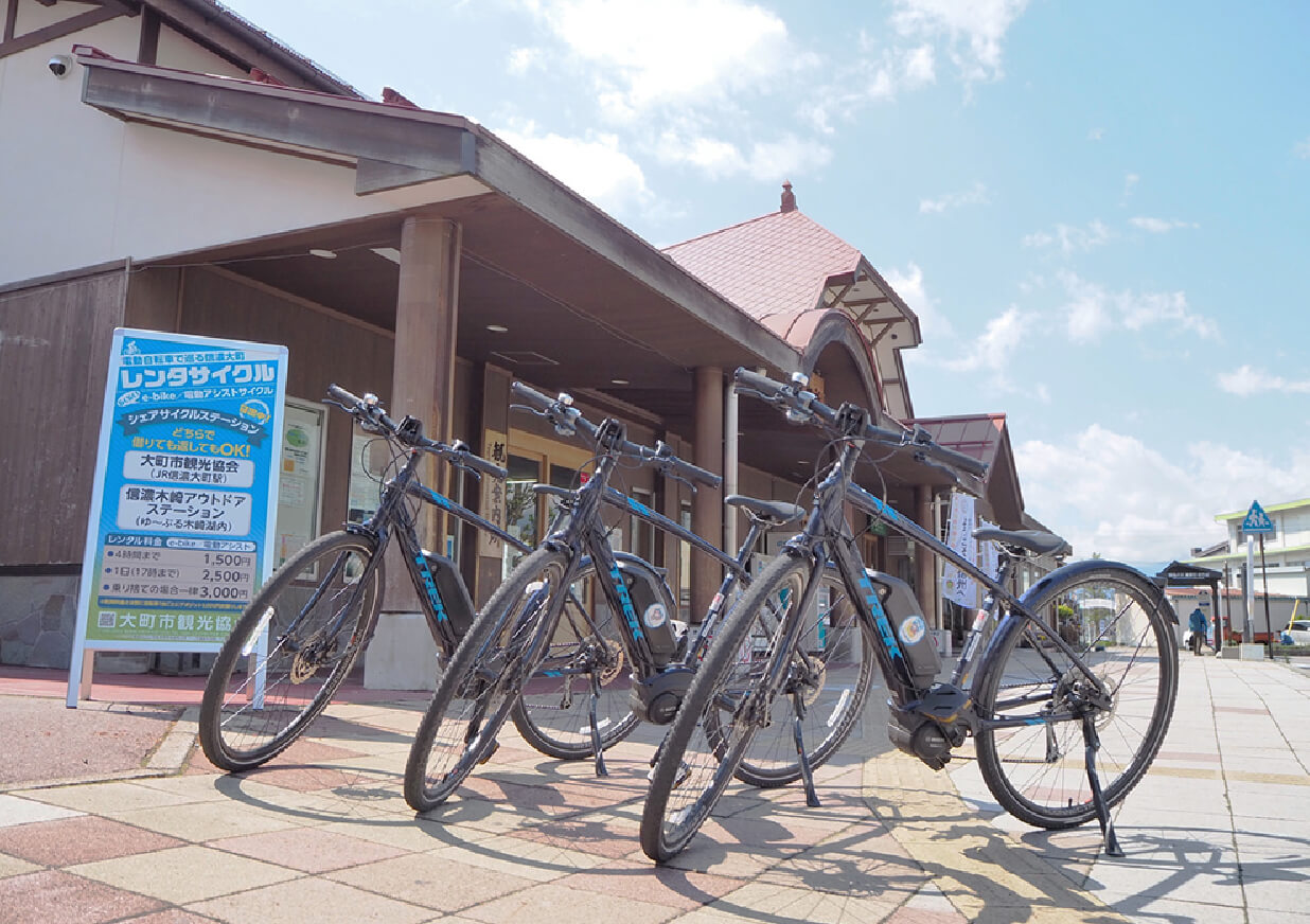 信濃大町では、どこからでも北アルプスを仰ぎ見ることができます。市内には3つのシェアサイクルステーション(信濃大町駅、木崎湖、温泉郷)があり、どこで借りても、どこで返却しても大丈夫です。新たに青木湖にもサイクルステーションが設置され、E-bikeのレンタルも可能になりました。気軽に自転車での旅を楽しんでみませんか?