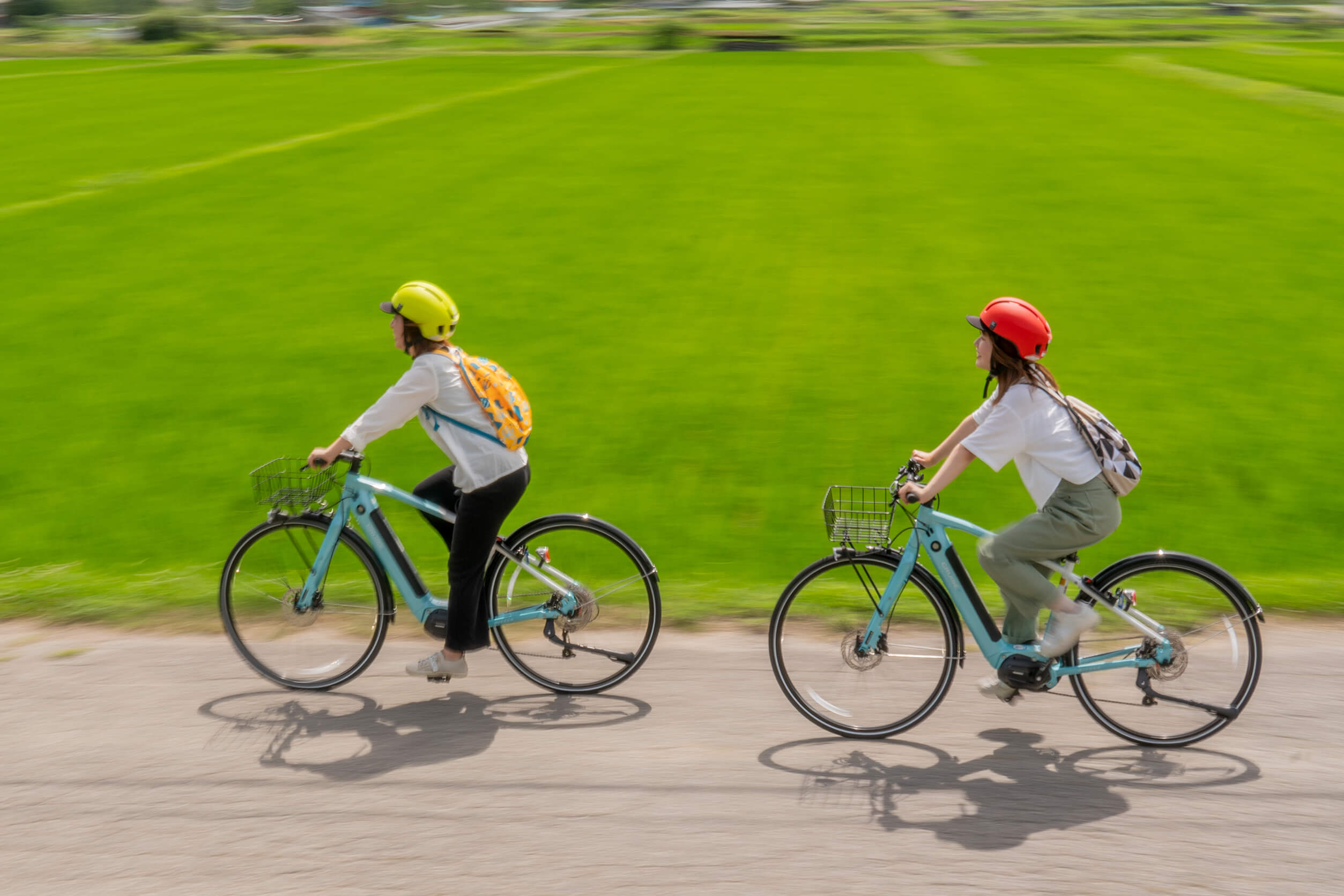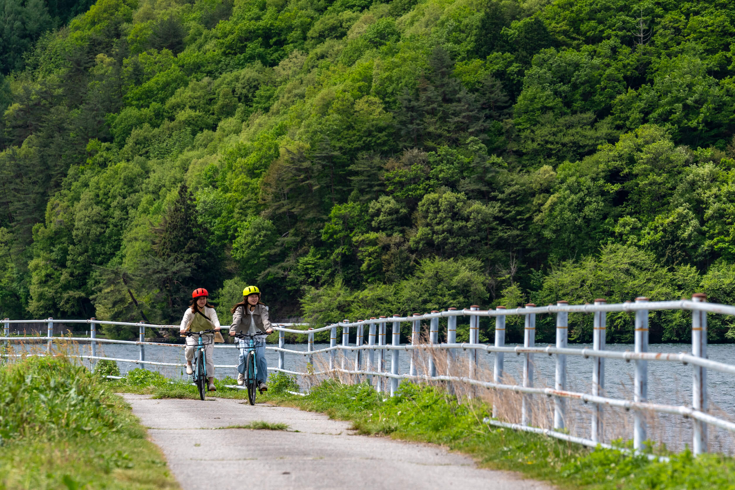 湖畔の美しい風景に包まれながら、静かな道をのんびりサイクリングできます。湖面に映る山々の景色は格別です。